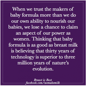 I understand that there are those rare and few women who cannot breastfeed their babies because of lack of breast milk production or other reasons. But….as a women who has lost ALL of her breast milk before and regained it back within a month AND who has breast fed ALL 5 of my children for over a year, ( my last I nursed until she was 3 1/2 or so), AND who has helped MANY, MANY other women learn how to breast feed their own children……..I believe it is very RARE to not be able to breast feed your baby. (If you want to know more about this or are curious to find out how you can make that happen EVEN when you haven’t been able to in the past, feel free to email me)